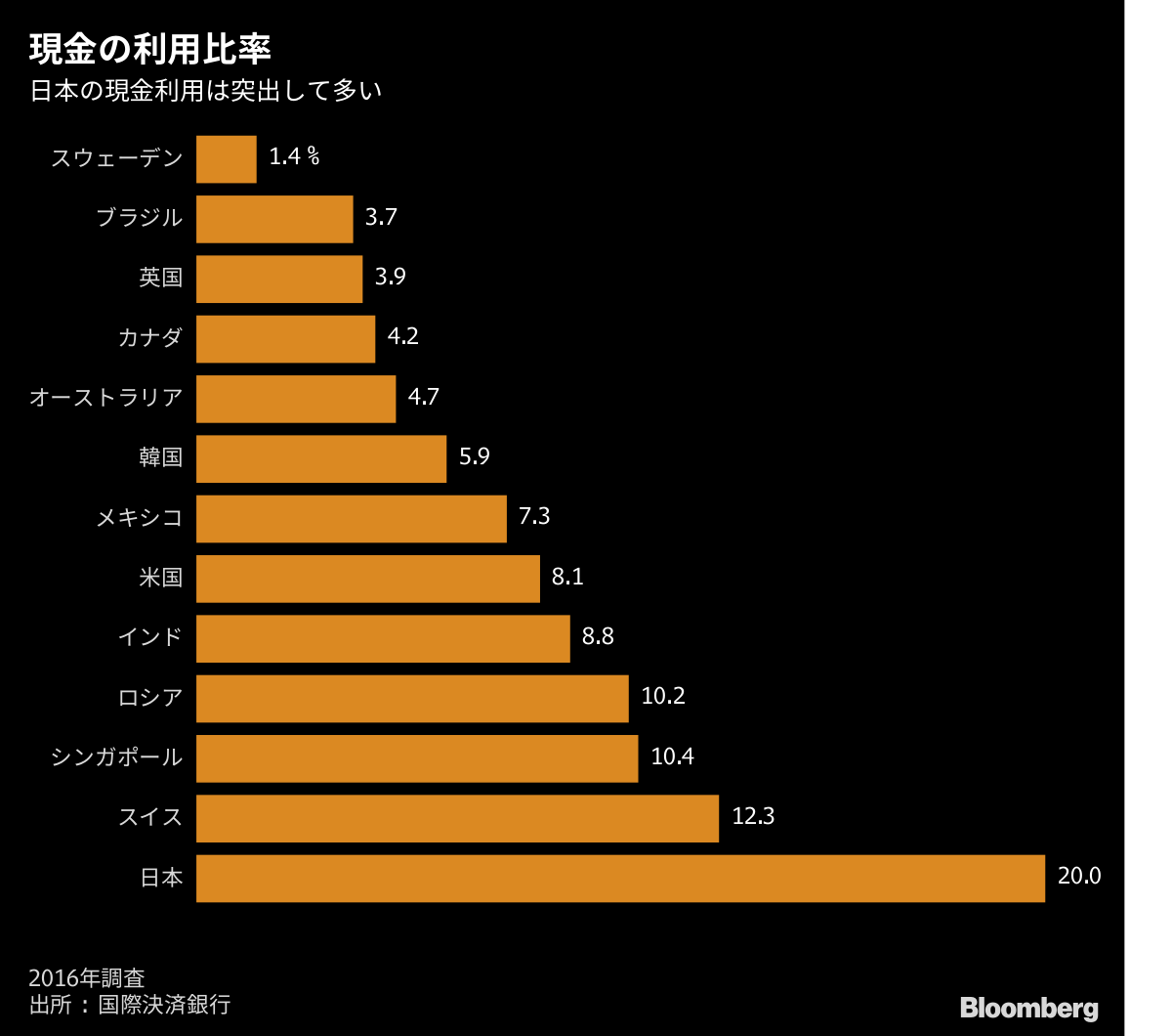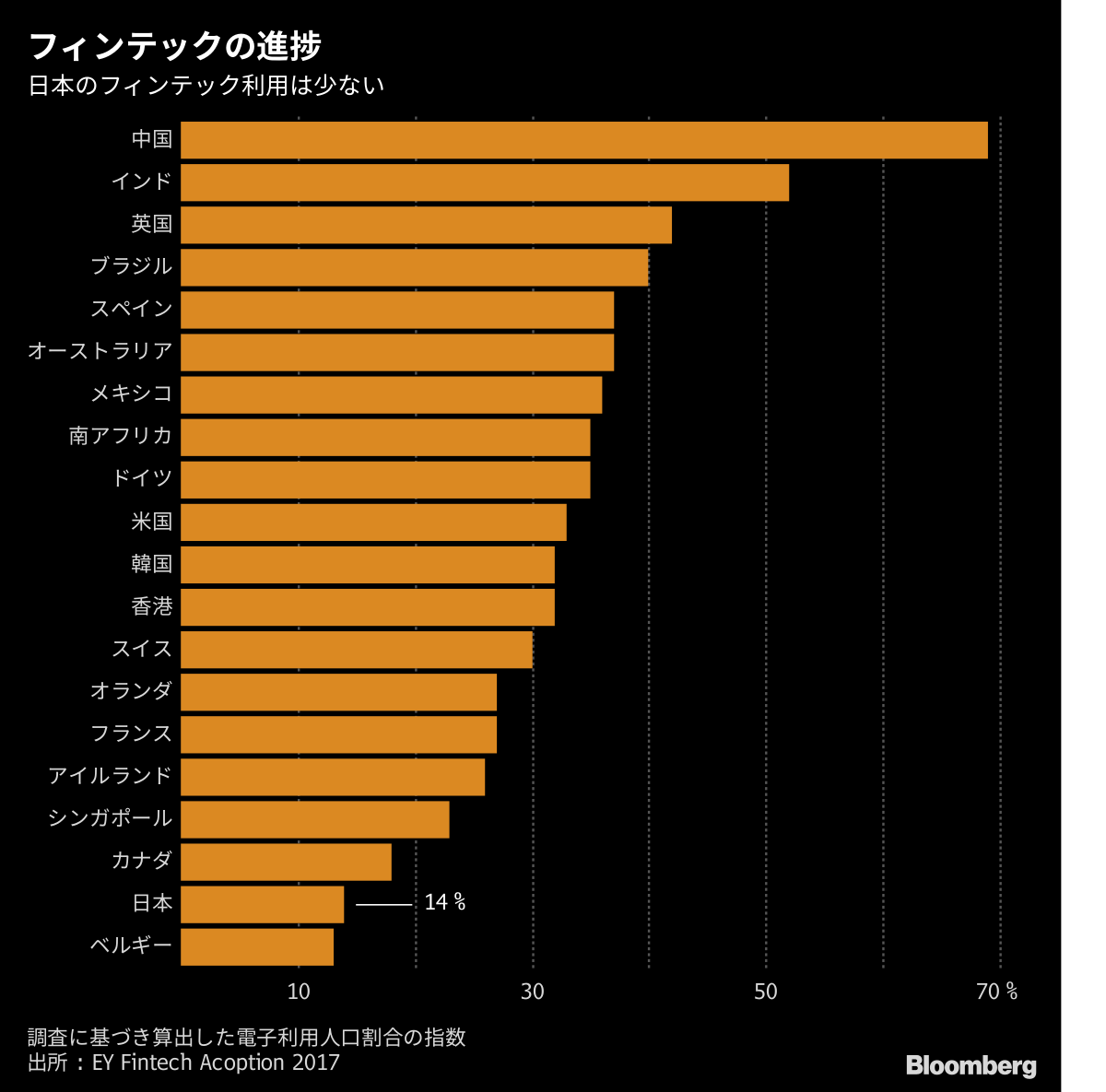 みずほFGユーロモニター・インターナショナルなどの調査を基に作成した資料によると、日本の現金決済比率は国際的に「特異に高い」のが現状で、現金取り扱いに伴う社会的コストは金融産業だけで約2兆円、小売りなどの産業も含めると約8兆円と試算。EYが公表したフィンテック技術が進んでいる国別のランキングでは、日本はメキシコやオランダ、南アフリカなど20カ国・地域中、下から2番目となっている。