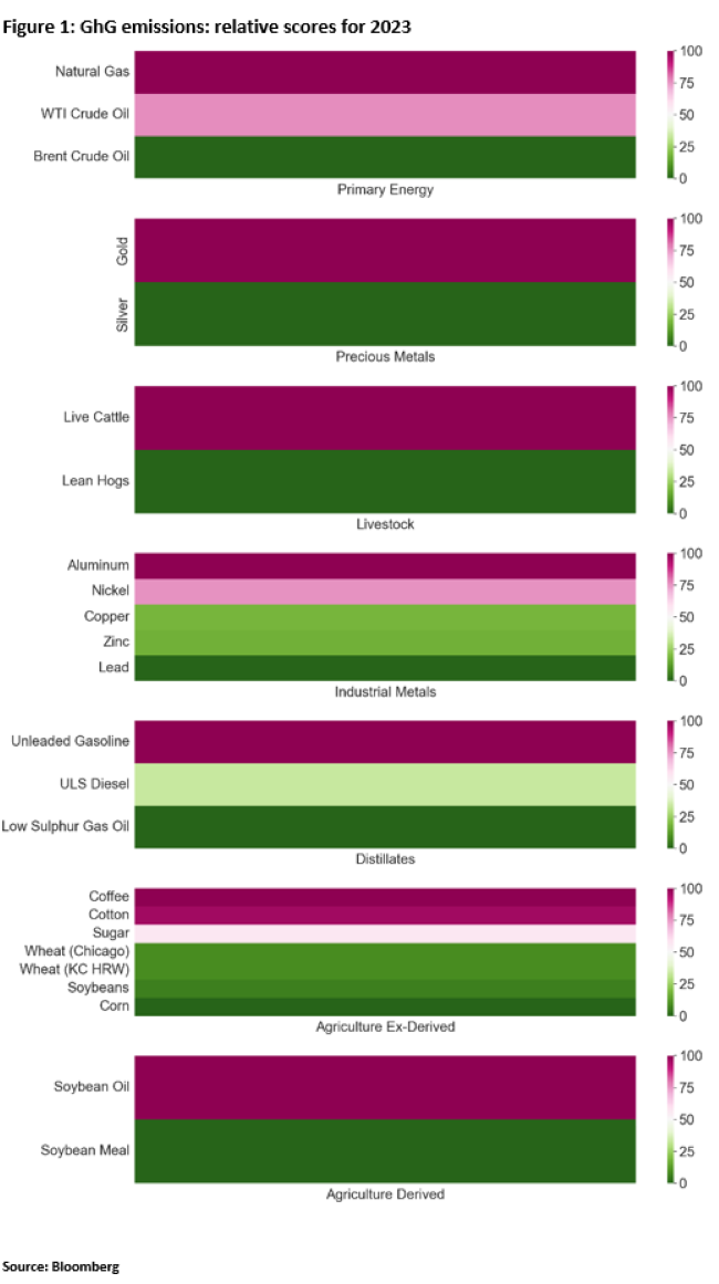 たとえ同じセクター内であってもコモディティ間で流動性に大きな差があること(例えば米ドル建て取引高の平均で測定)は、ティルトはベンチマークのアロケーションとGHG排出量のウエイトの両方の関数とすべきことを示唆しています。後者では、均等ボラティリティ・ポートフォリオを構築する際に使用するものと同様に、排出量の逆指標を使用します。