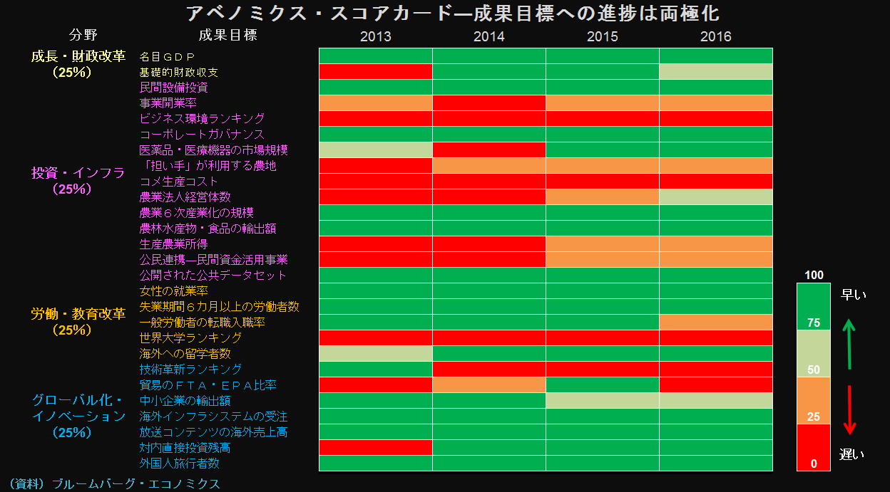 生産性の停滞は世界的減少だが、アベノミクスの第三の矢の構造改革では、生産性改革を課題に挙げていた。増島氏のスコアカードでは、コーポレートガバナンス(企業統治)やインバウンド(訪日外国人客)を成果に挙げ、農業やイノベーション(革新)は出遅れたままだ。