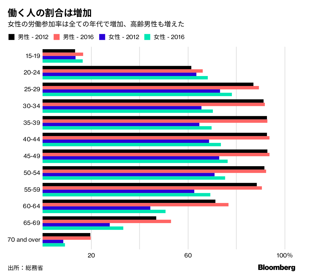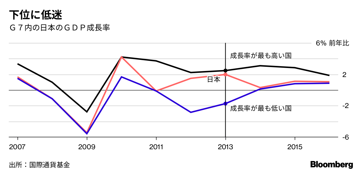 ブルームバーグ・エコノミクスの増島雄樹エコノミストは、アベノミクスは労働生産性の向上に失敗していると指摘する。製造業は改善したものの、雇用の70%を占めるサービス分野では3年から16年までに10%超低下した。