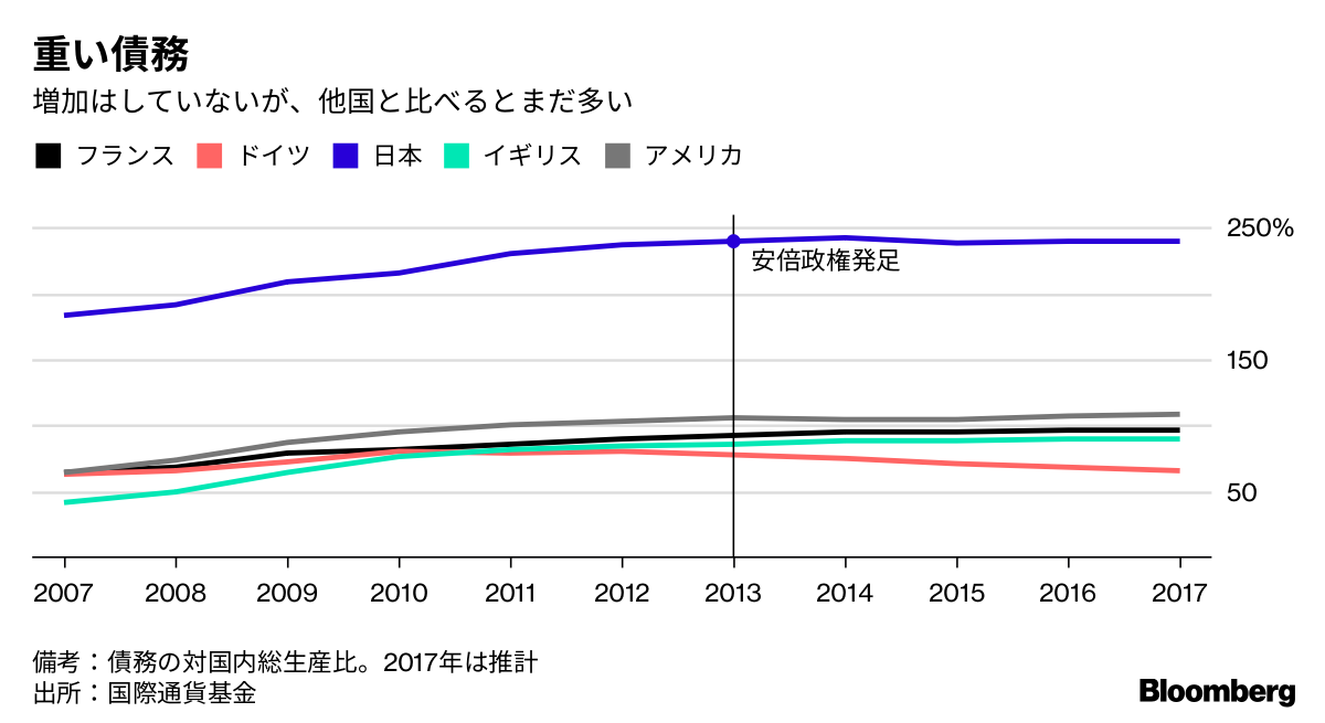 国際通貨基金(IMF)によると、安倍政権下の日本の債務はGDPの240%で推移している。増加していないことは評価されるべきだが、負担はまだ他国より重い。人口が減少する中、1人当たりの債務は増え続けることになる。