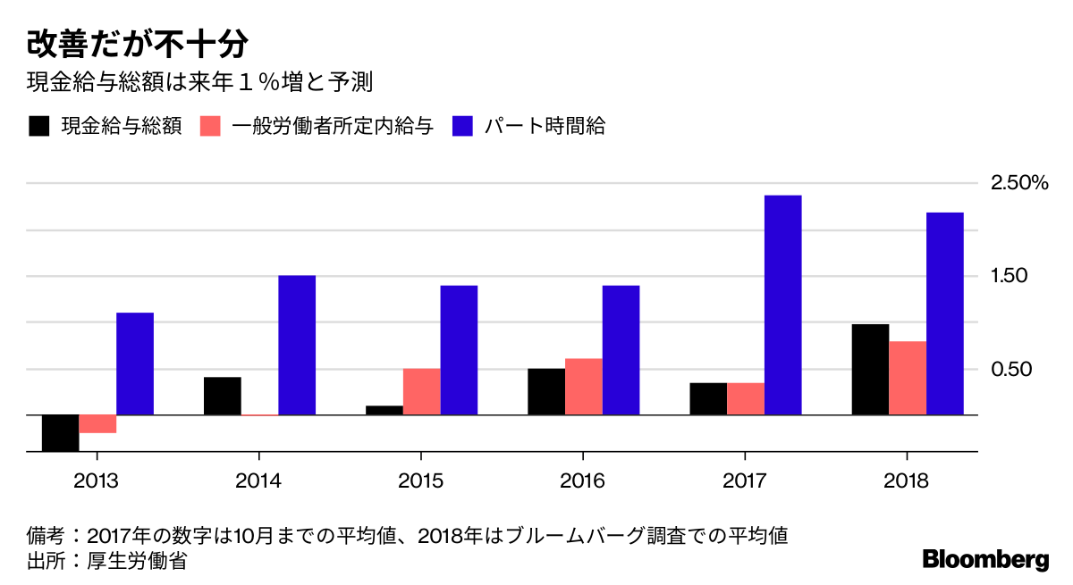 ブルームバーグのエコノミスト調査によれば、18年の現金給与総額(ボーナス、残業を含む)は前年比1%程度の上昇にとどまると予想されている。家計が消費を増やし、企業が自信をもって価格を上げるには不十分な水準だ。