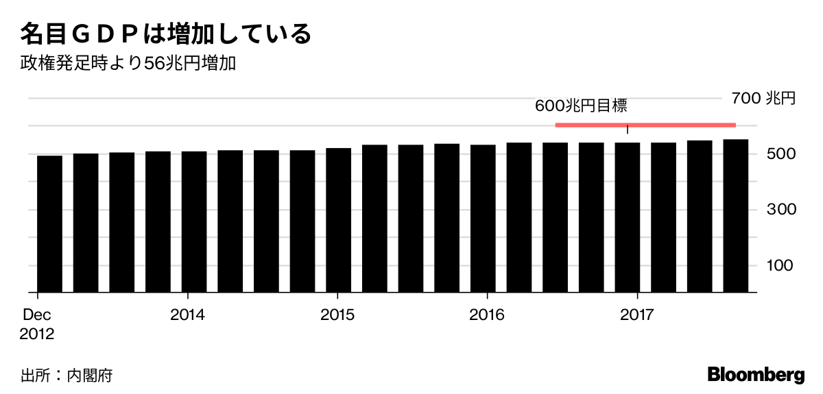 経済成長は緩やかで、安倍首相が掲げた国内総生産(GDP) 600兆円には遠いが、2012年の政権発足時からは56兆円増えた。増加分は、ベルギーのGDPより多い。