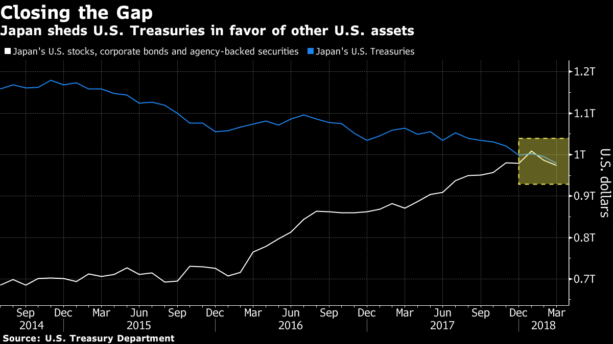 しかし、これは彼らが米国に完全に見切りをつけたことを意味するわけではない。実際、日本の投資家は記録的な金額を米国の株式や社債、エージェンシー債に振り向け、これらの資産への投資額は今年、初めて1兆ドル(約110兆円)を超えた。これとは対照的に、米国債保有は大きく後退しており、日本の保有残高は7年ぶりの低水準に落ち込んでいる。