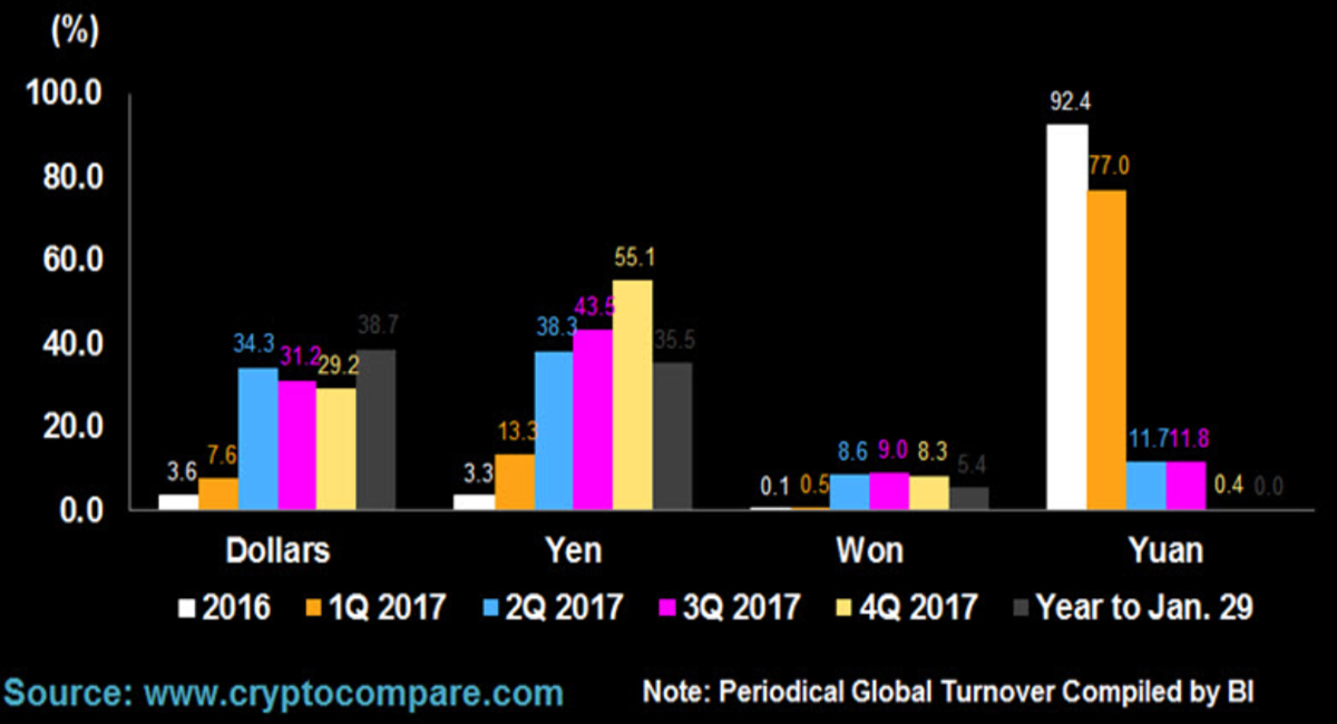 2017年末、規制厳格化により中国のシェアが縮小し、日本が最大の仮想通貨市場となった。 cryptocompare.comのデータによれば、日本のトレーダーは、他の仮想通貨よりビットコインの取引に重点を置いている。 ブルームバーグ・インテリジェンス(BI)の集計では、17年10ー12月(第4四半期)の日本円による仮想通貨取引の世界シェア