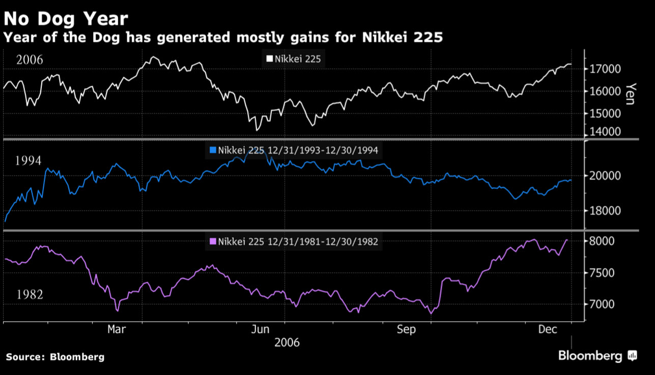 日経225平均株価は1949年の算出開始以来、5回の戌年を経てきたが、干支ベースによる勝率は4勝1敗である。大和証券のデータによれば、日経平均はこれまでの戌年である1958年には41%、1982年には4.4%、1994年には13%、そして2006年には6.9%上昇。唯一の1敗は1970年、16%下落した年だけだったという。