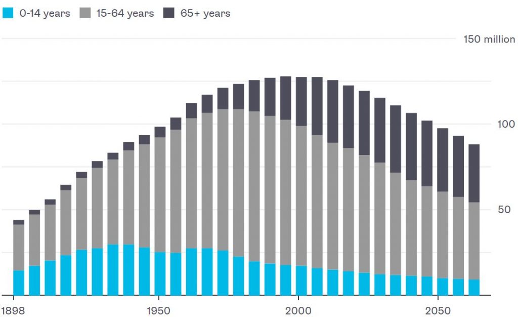 20世紀の終わりにはかつての3倍にもなった日本の人口ですが、2065年までにさらに数千万人減少すると予想されています。この過程では高齢者人口が増加する一方、第2次世界大戦前がピークの年少人口は事実上消失するでしょう。