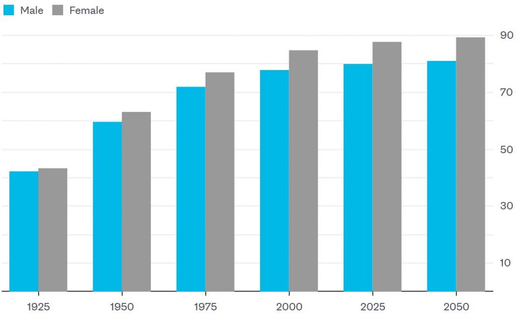65歳以上の高齢者は増加するだけでなくその寿命も延びており、女性の平均寿命は2050年までに1925年の2倍の90歳近辺に達する模様です。多くの高齢者にとっては、介護してくれる家族自体が高齢者になる可能性があるのです。