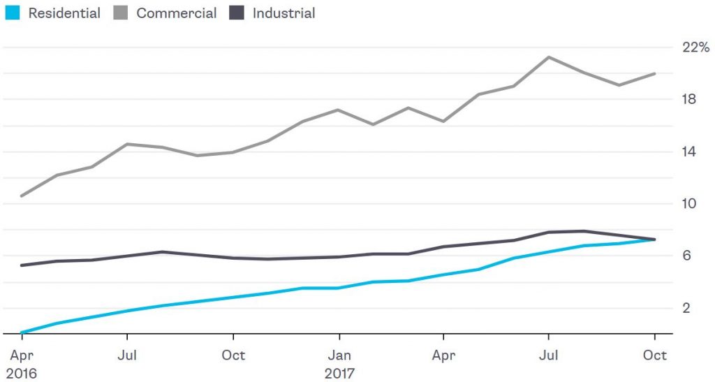こうした提案は公共事業者の事業分野として拡大しつつあります。日本の電力セクターは長年、垂直統合型モデルにおいて世界でも際立つ存在でしたが、規制緩和の波で競争が激化しました。昨年の垂直統合型地域電力会社を除く企業の家庭用電力需要に対する供給率は7パーセント強でしたが、わずか2年足らずの間にゼロからここまで成長したのです。そして調査を開始した昨年以降も、競争は激しさを増すばかりです。
