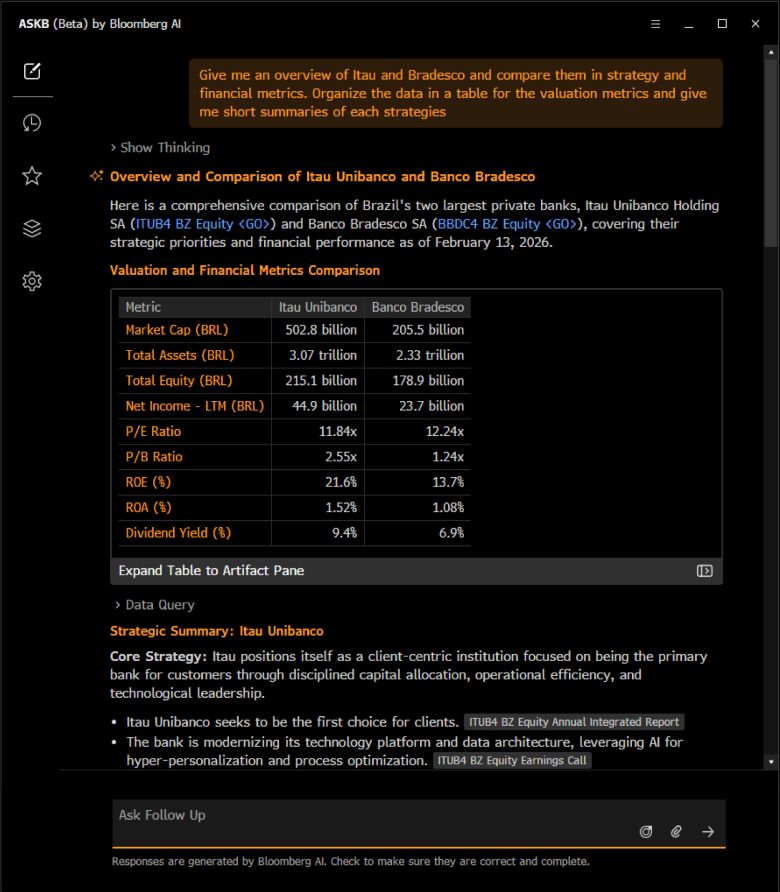 ASKBは、複数のAIエージェントが同時に作動するよう配置し、ブルームバーグ ターミナルへ直接組み込んでいます。これらのエージェントは、ブルームバーグのデータ、ニュース、リサーチ、分析に動的にアクセスし、市場、企業、投資アイデアに関する複雑な質問に対して、文脈に沿った奥の深い回答を提供します。
