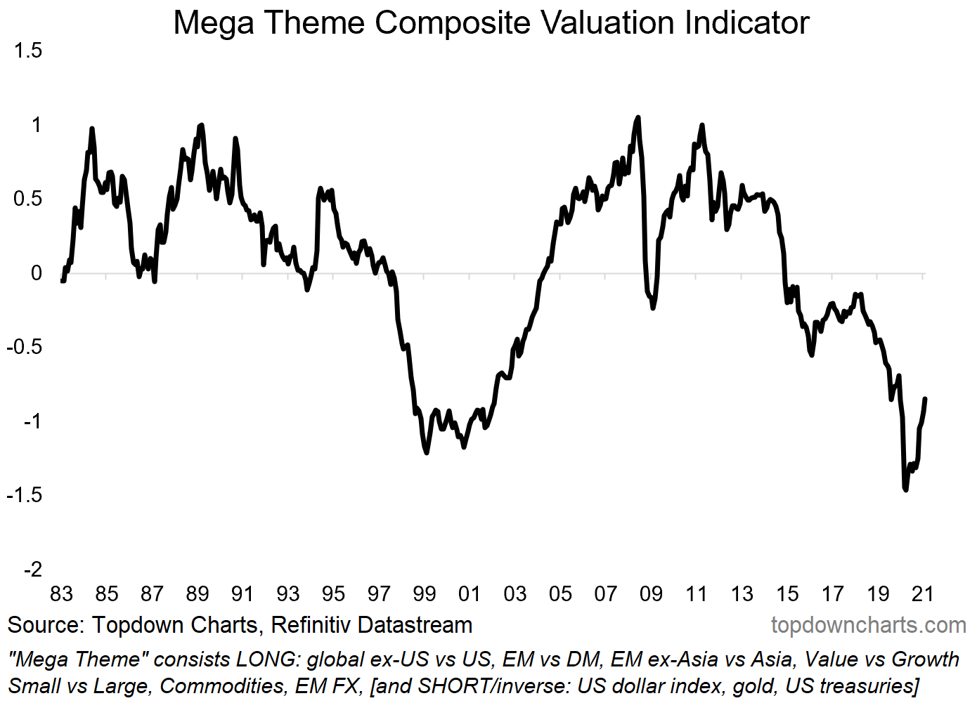 Topdown Chartsでリサーチのヘッドを務めるCallum Thomasによれば、現在のメガテーマバスケットは、2000年頃の安値よりわずかに高い水準にあります。2000年の時はその後に力強い上昇を見せました。